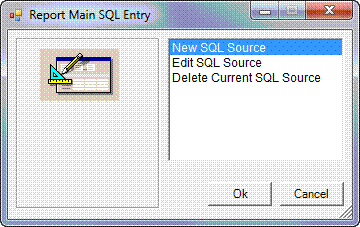 The Report Main SQL Entry window is displayed, with New SQL Source selected. This is the only way you can make a connection to a data source; click OK to proceed.