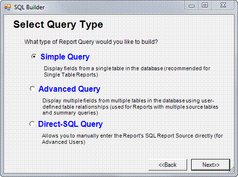 The SQL Builder dialog box opens, giving you three types of queries from which to choose. Simple Query and Advanced Query use a query wizard to guide you easily through the process. To use Direct-SQL Query, you must know the syntax used to create SQL commands. The options are described in detail below. Click on one of the query types below to go to the instructions for that type. Upon completion of that section, proceed to Creating the Custom Report Layout.