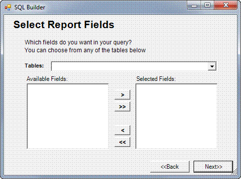 In the Select Report Fields window, identify the table to use as the data source. Use the drop-down list in the Tables field to select from the list of all available tables in your database or type the table name directly into the field if you already know it.