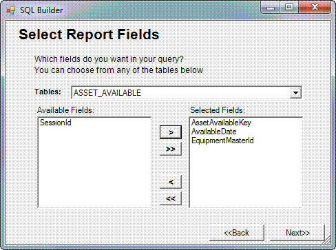 Click an Available Field name (or as many as you’d like), then click the selection buttons between the listing fields to move the highlighted Available Fields to the Selected Fields pane on the right. Use the [>] or [<] buttons to move only selected fields to the right or left, respectively. Use the [>>] or [<<] buttons to move all fields from one list to the other. To deselect a field name, click it again.