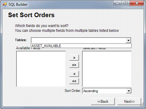 The Tables drop-down list will contain only the table chosen in the previous step – select that table. Then, use the selection buttons to move the selected Available Fields to the Selected Fields pane. On the Sort Order drop-down menu, choose between Ascending or Descending order.