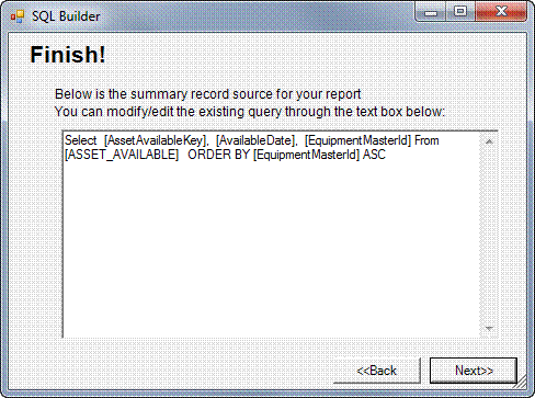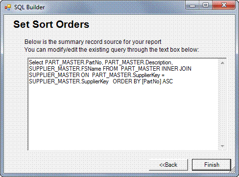 You are now on the Finish screen. This window contains the actual SQL query statement that the program uses to retrieve the data from the data source for your report. You can modify the query by editing the text in this window, if you know the right syntax for creating SQL statements; however, if you do not do this correctly, an error message will appear. We recommend that users not edit the SQL statement displayed in this window.