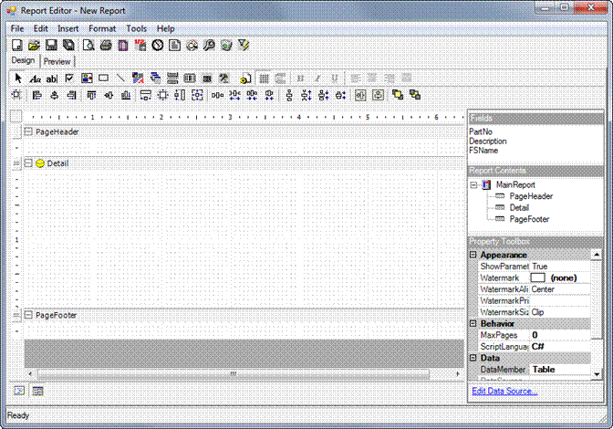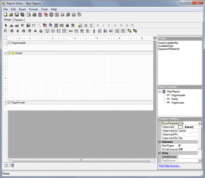 The section on the left is the Designer Canvas, used to design your report. Every item on the Designer Canvas is a Report Control. The types of controls are shown on the toolbar at the top of the Report Editor. We will place a few of these controls on the canvas.