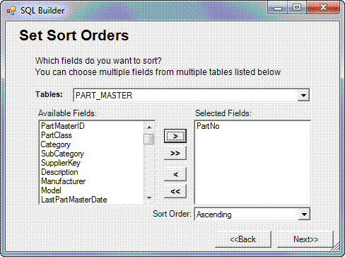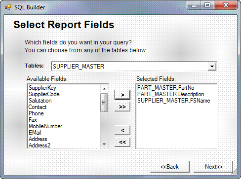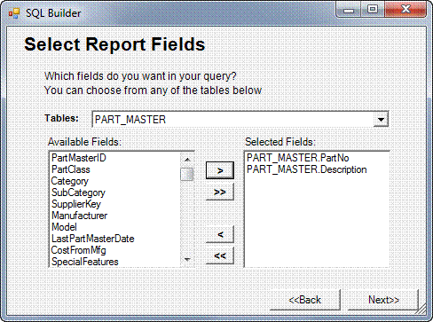 In the example above, PartNo and Description were selected from the Part_Master table and FSName was selected from the Supplier_Master table. The two tables are linked by the common field SupplierKey, which is not one of the fields selected to appear on the report. Fields used to link tables need not be included in the Selected Fields list. Click Next when you are finished with your table selection.