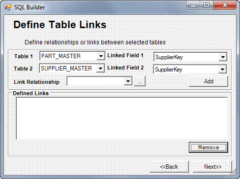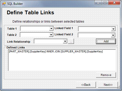 To commit the entries that you have made in the Define Table Links window, click the Add button. Your selections will be placed in the table in the Defined Links pane.