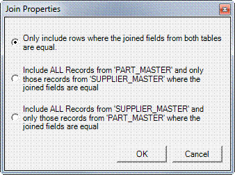 Three relationship options are available to link/join the tables. Make your selection and click OK. The Join Properties window will automatically close.