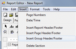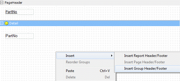To create a group, right-click anywhere on the Designer Canvas and select Insert Group Header/Footer from the pop-up menu.