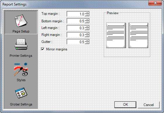 The Report Settings window is used to set page setup, printer settings, grid settings and styles for your reports. From the main icon bar, click the following icon to open the Report Settings window: