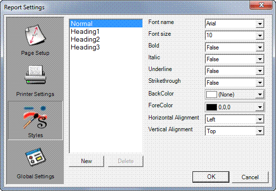 Use this window to appropriately and uniformly style the type in your reports. Four basic styles are included for your convenience: Normal, Heading1, Heading2 and Heading3. Each of these styles has different attributes according to how it might be used in a document; for instance, the Heading styles are all bold for emphasis, while the Normal style is plain rather than bold and of a suitable size for body text on a page.