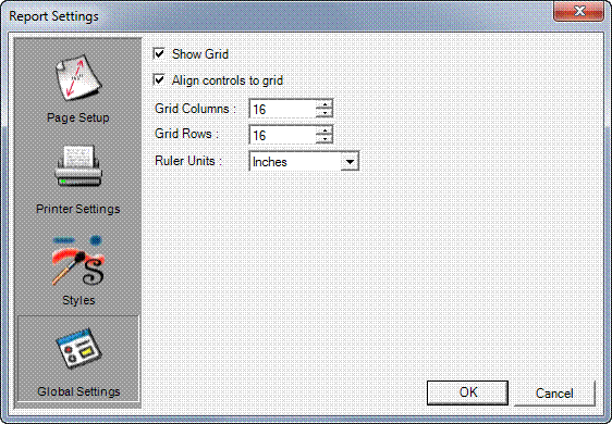 The tiny dots that are evenly distributed over the canvas make up the grid, which is intended to give you guidance in the design and layout of your report. The dots will not appear on your printed report. The spacing of the dots in rows and columns is defined within Global Settings. By default, there are 16 dots to an inch, both horizontally and vertically.