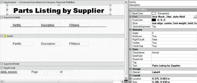 The basic report format has three sections: Page Header, Details and Page Footer. The Header and Footer information is repeated on each page of the report while Details contains the body of the report. Labels are typically placed in a Header section; database fields typically reside in the Details section.