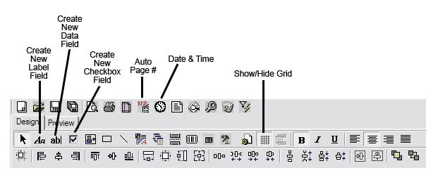 Every report must have a page header and footer. The page header usually contains the report title and the titles of the columns. The footer usually contains the page number. You can create titles using the label button; the report editor also includes buttons that generate automatic page numbers and a date-time stamp. Click the desired button. A field containing the pertinent information will appear on the Designer Canvas; drag it wherever you want that information to appear.