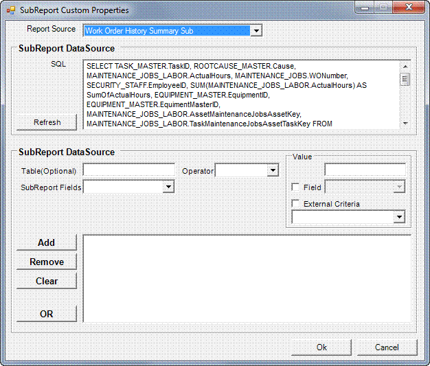 SQL: The SQL statement used in opening the data source of your sub-report. This is a non-editable field and is provided here so you can immediately see the tables and fields that are used in your sub-report. This is particularly helpful in finding out if the field you need to use for the link is contained in only one table or more than one.