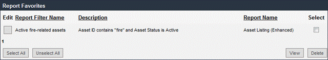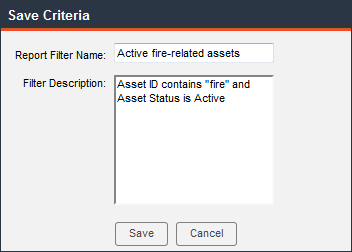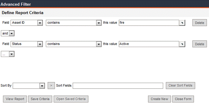 In the example below, the Asset Listing report will be filtered for all fire-related, active assets. Begin by selecting a field by which to filter and then enter the remaining criteria in that row. Click the Add button to the right of that row. Enter a second field and remaining criteria. Continue to add criteria as needed.