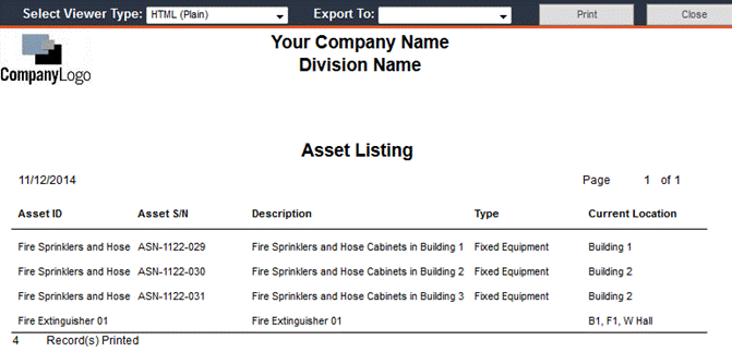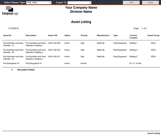 Asset Status Report: This asset status report creates a summarized list of assets, based on the status you select. Use this report to print a list of all inactive assets or items in need of repair. You can also print a list of your spare or backup assets. If you leave the Status field blank, the list will include equipment of any status.