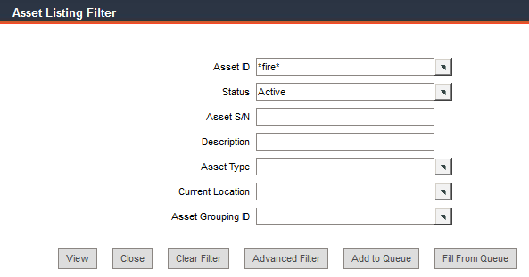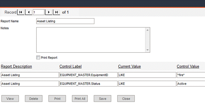 The selection of an enhanced report will open a filter that allows you to define a specific group of records to analyze. Some reports allow you to sort data according to your preference, many reports give you a choice between a summarized listing and a detailed report and most of the report filters contain special options. The filter options will vary depending on the report you’ve chosen to view, i.e., Date, Asset ID, Task ID, Asset Type, Current Location, Description, Staff ID, etc. To view all records, leave all filter fields blank. Use the Clear Filter button to clear all field contents.