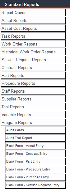 FaciliWorks includes printable data collection worksheets that will allow you to compile organized, complete records to enter into FaciliWorks. Navigate to Reports -> Standard Reports -> Program Reports and select a Blank Form worksheet.