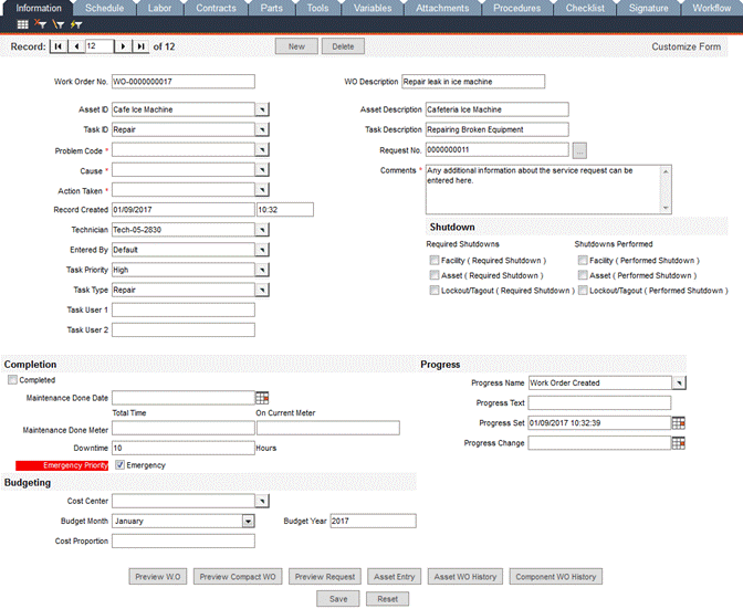 Preview Request: If the work order was created via a service request, click this button to view the service request that prompted this work order.
