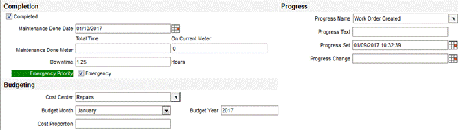 Progress Set: FaciliWorks automatically enters the date of the last change in the progress of this work order. This date can be changed manually.