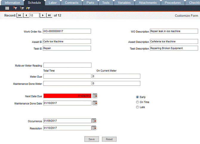 In the Schedule tab, you can view the maintenance scheduling information auto-filled from the task record. Any of these fields can be changed prior to the completion of the work order. This information becomes part of the maintenance history for the asset.