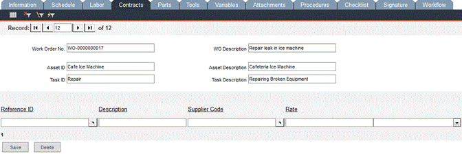 Access the Contracts tab to enter contractor information associated with the work order. Make a selection from the Reference ID pop-up list. All related fields will auto-fill from information entered within Data Administration -> Contractors: