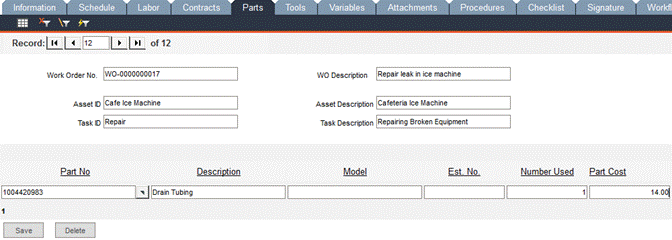 When the work order has been completed, revisit this form to enter the Number Used. FaciliWorks automatically calculates and display the total cost in the Part Cost field.