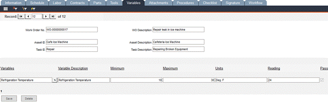 If the task associated with this work order has variable data attached to it, the Variables screen displays that variable information that you entered in the Tasks -> Variables tab. In this screen, you can edit the variable information to apply specifically to this work order.