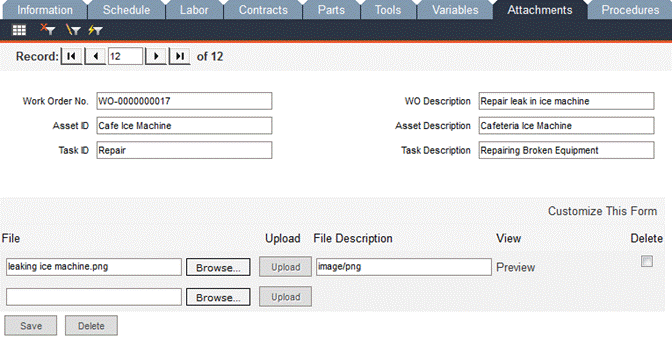 Use this tab to attach instance-specific documents to work orders, such as the asset’s warranty or service contract information, manuals, photos or special handling instructions. You can have all the information at your fingertips in the WO without having to reference the asset record. If this work order is from a service request, then any attachment made to the service request record will be carried over and shown on this screen.