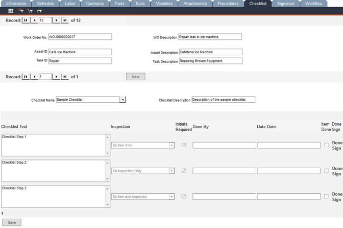 When entering the original checklist record, you specify whether or not initials are required for each step. This specification translates to the Checklist tab in Work Order Manager: if the original checklist record shows that initials are required for a particular step, the Work Order Manager -> Checklist tab will show Done Sign in the row associated with that step.