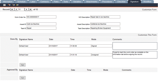 If the work order needs to be modified and has been signed, it must first be unsigned (can only be unsigned by the original signer). If a signature has been attached to the approval, the Approved By record must be unsigned before the Done By record can be unsigned (the Unsign button in the Done By pane will be inactive until the approval has been unsigned).