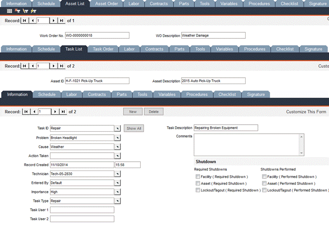 In this screen, attach multiple assets to a single work order. Each asset can have multiple tasks. The upper row of tabs here, with the exception of the two explained below, are similar to those found within a typical work order. Please see the Work Order Manager section for details. The sub-tabs within the Asset List tab are identical to those of a typical work order and can be filled out as such, but they apply only to the specified asset.